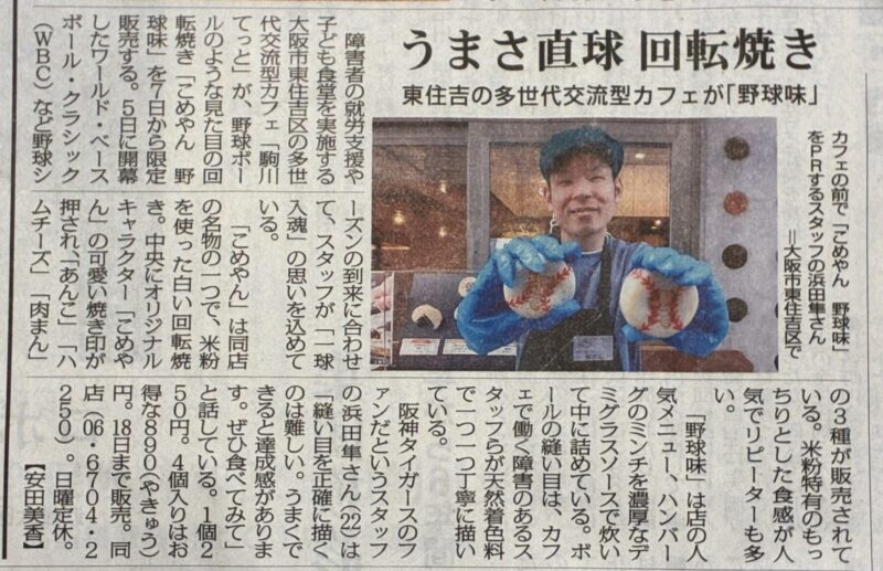 この度、2026年3月7日付の毎日新聞(大阪版)にて、当カフェの新メニュー「こめやん 野球味」をご紹介いただきました!